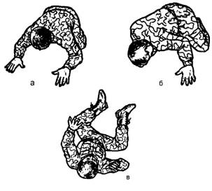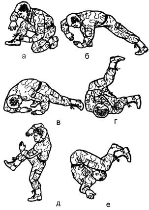вбок в сторону Из исходного положения сидя на коленях поставить ладони на пол и перенести массу тела на правую ногу (рис. а). Разворачивая правую кисть ладонью вверх и поджимая локоть к животу (рис. в), перекатиться на спине в правую сторону (рис. в), после чего принять исходное положение. Затем повторить упражнение в другую сторону. Вслед за кувырками вперед и назад