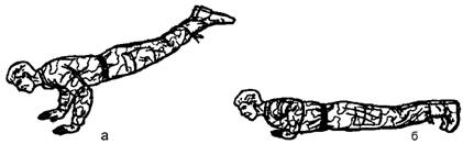 При падении вперед необходимо подпрыгнуть вверх вперед и опуститься вперед на слегка согнутые руки с разведенными в стороны локтями (рис. а). Затем перекатиться с груди до бедер через живот (рис. б) и быстро встать. |
