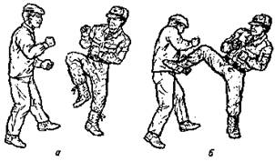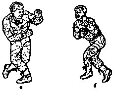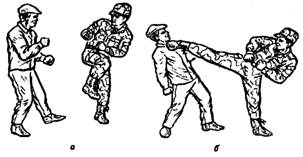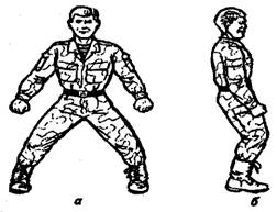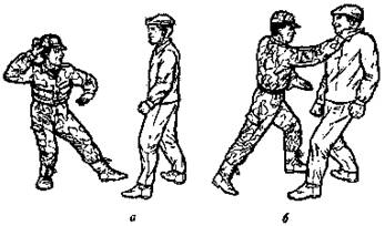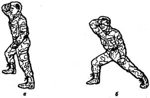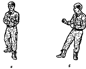Предполагаемый противник находится сзади, и, чтобы не подставить для атаки спину, необходимо развернуться к нему боком (рис. а). Сзади стоящую ногу можно быстро подтянуть к впереди стоящей ноге, нанести удар и перейти в другую стойку. Одна рука защищает кулаком пах, другая голову (рис. б).