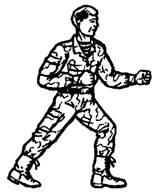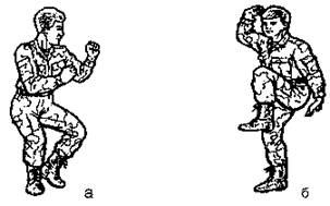 левой ноги. Приподнятая стойка (рис. б) Если предыдущая стойка используется в основном для ведения боя с противником на нижнем уровне, то приподнятая стойка предназначена для отражения атаки противника и для контратаки на верхнем уровне и в прыжке. |
