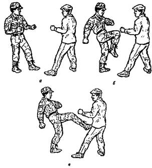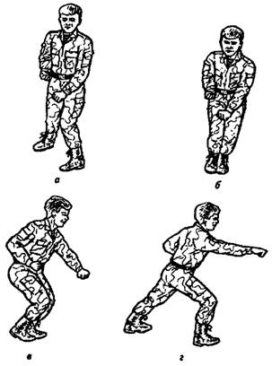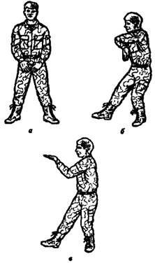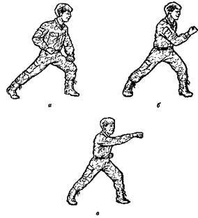 Колени держатся вместе, левая рука закрывает пах от возможной атаки (рис. б). В этой промежуточной стойке правая нога, свободная от нагрузки, готова к нанесению любого удара (рис. в).