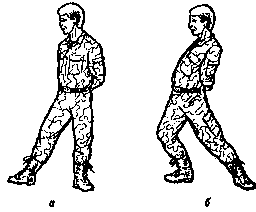 Из исходной позиции ноги на ширине плеч, руки внизу (рис. а) перейти в левостороннюю переднюю стойку (рис. б), отставить правую ногу назад. Далее левая нога подтягивается к правой и через промежуточное положение выполняется переход в правостороннюю заднюю стойку (рис. в).