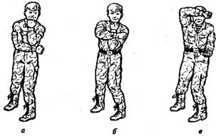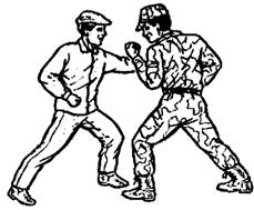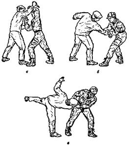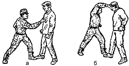 Защищающийся уходит в заднюю стойку с одновременным ударом предплечьями сверху по рукам противника. В результате этого противник теряет равновесие, его руки сгибаются в локтях (рис. б). С резким переходом в переднюю стояку защищающийся атакует противника ребрами ладоней в шею (рис. в).