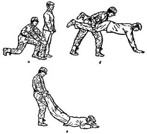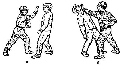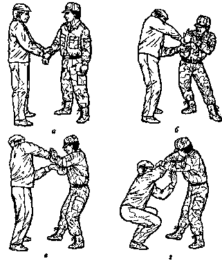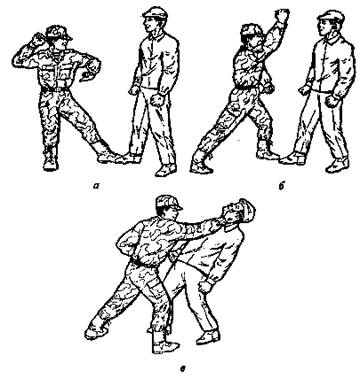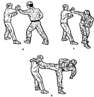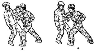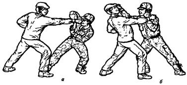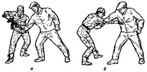 рукой (рис. а). С уходом в заднюю стойку защищающийся выполняет рывок на
