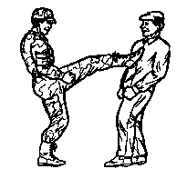 Защита от удара ногой Противник атакует ногой в пах. С уходом в заднюю стойку защищающийся