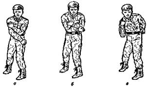 ладони правой руки надавливая на запястье противника (рис. в). После этого с