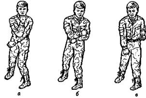 Вариант 1.Из исходного положения (рис. а) выполняется переход в правостороннюю заднюю стойку с поворотом корпуса на 90º на месте. При этом масса тела переносится на левую ногу, стопа левой ноги остается неподвижной, стопа правой ноги совершает разворот на пятке. Для отработки координации движения базовое перемещение целесообразно выполнять с движением рук. В начале движения корпуса выполняется подтягивание вверх ладоней, соединенных тыльными сторонами, локти при этом направлены в стороны (рис. б). В конечной фазе поворота кисти выводятся перед корпусом за счет вращения предплечий в локтевых суставах, а локти обеих рук соединяются (рис. в). Поворот в другую сторону совершается в той же последовательности. |