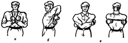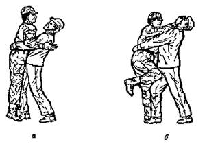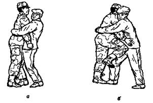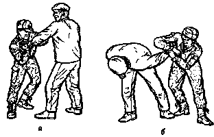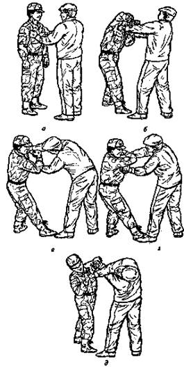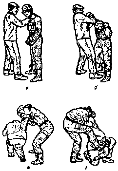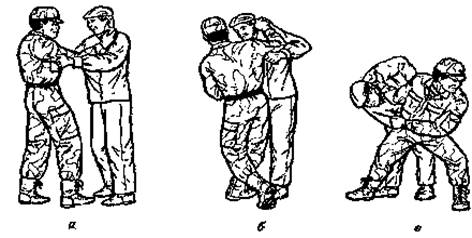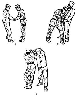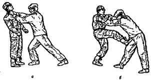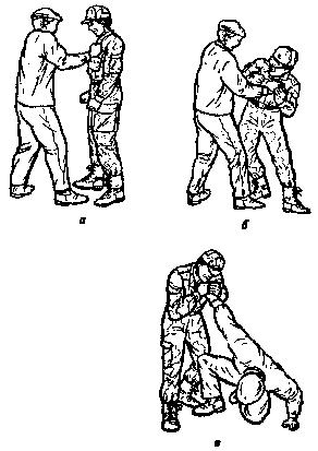 спереди При захвате противника за плечи спереди (рис. а) за счет ухода в левостороннюю заднюю стойку защищающийся выполняет нырок под правую руку |