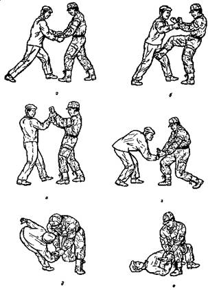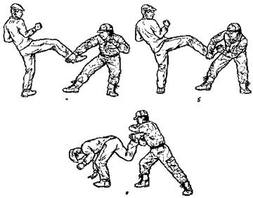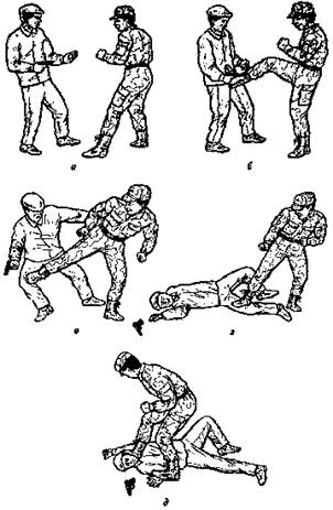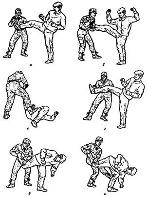 При атаке противником ударом правой ноги защищающийся уходит с линии атаки в левостороннюю заднюю стойку с одновременным подхватом атакующей ноги противника (рис. а). Затем защищающийся левой рукой проводит захват за голень атакующей ноги и переходит в правостороннюю заднюю стойку. При этом он правой рукой хватает стопу атакующей ноги за носок и локтем выполняет болевое удержание этой стопы (рис. б) с последующим броском противника на землю и атакой в пах (рис. в). Если при подхвате ноги левая рука защищающегося оказалась близко к коленному суставу противника (рис. г), то при захвате ноги осуществляется разворот противника спиной толчком подхваченной ноги (рис. д) с последующей атакой правой ногой в коленный сгиб опорной ноги противника (рис. е).