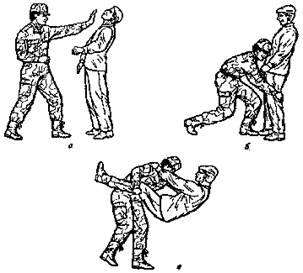 воздействием на большой палец противника (рис. б), Затем в момент разворота в