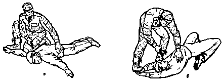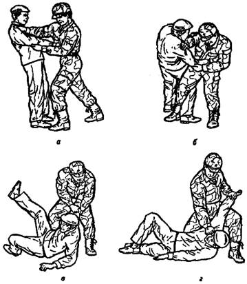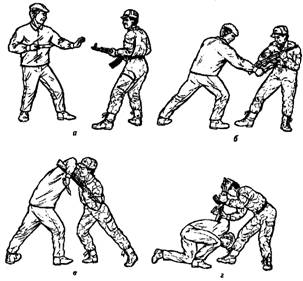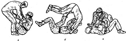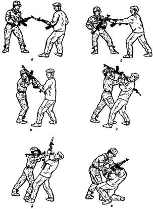 При ударе ножом сверху за счет базового движения проводится поворот вправо с одновременным блокирующим действием на руку противника и контратакой прикладом в голову (рис. а). При последующем развороте в противоположную сторону происходит опрокидывание противника на землю за счет захвата прикладом его шеи и толчка блокированной руки (рис. б, в).