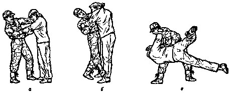 Противник схватил за одежду и пытается атаковать в ближнем бою (рис. а). Защищающийся проводит резкий поворот корпусом, как в базовом движении, но стопа прижимается к ноге противника, блокируя ее продвижение вперед (рис. б). Далее он выполняет рывок противника за одежду и бросок (рис. в).