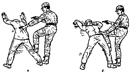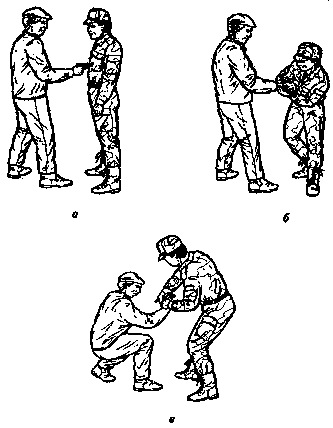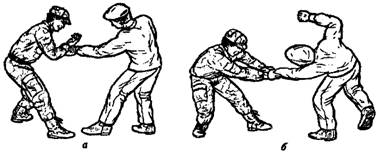 себя, прижимая левой рукой кисть противника к своей правой руке (рис. б).
