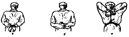 При захвате противником одежды на груди двумя руками (рис. а) на базовом повороте в левостороннюю заднюю сточку наносится удар локтем, дающий возможность захватить кисть правой руки противника (рис. б). При развороте в правостороннюю заднюю стоику защищающийся выводит эту кисть противника на болевой захват ребром ладони вверх (рис. в).