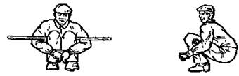 Пятки крепко упираются в пол, ступни ног параллельны, ноги разведены шире плеч и согнуты в коленях. Масса тела распределена на обе ноги. Мышцы ног напряжены. Спина прямая, грудная клетка выдвинута вперед, таз подан назад. Сохраняя положение ног на месте, развести колени наружу. Действия ног похожи на приседание. Руки могут быть опущены вдоль туловища, сжаты в кулаки или согнуты в локтях, предплечья на пояснице.