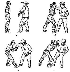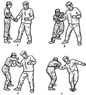 При попытке ухода в заднюю стойку противник не потерял равновесия, а продолжает крепко удерживать руку (а). Защищающийся резко меняет направление движения, выходит в переднюю стойку и захватывает кулак удерживаемой руки (рис. б). В конечной фазе выпада вперед он проводит рывок локтем снизу вверх, ослабляющий захват (рис. в). Далее наносит противнику удар кулаком в лицо, усиливаемый уходом в заднюю стойку (рис. г).