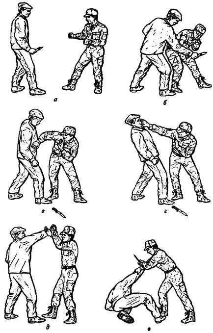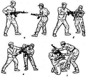 оружием Противник, делая выпад, атакует штыковым оружием (рис. а). С разворотом вправо в заднюю стойку (базовое движение) защищающийся отбивает штык в сторону стволом автомата (рис. б). Далее следует подбив прикладом снизу под левую кисть противника, держащую оружие (рис. в). Если противник не выпустил оружие из левой руки, то при повороте вправо проводится удержание его левой кисти между правой рукой защищающегося и прикладом его автомата с болевым воздействием на левую кисть противника. При этом защищающийся бьет противника по голове магазином автомата, что облегчает опрокидывание его на землю (рис. г). Защита автоматом от удара ножом снизу При атаке противником ножом снизу защищающийся делает шаг в сторону с поворотом корпуса влево (уходит с линии атаки), одновременно отбивая при этом стволом автомата руку с ножом (рис. а). За счет разворота в противоположную сторону на базовом движении наносится удар противника прикладом в область печени. Левая рука защищающегося при проведении контратаки остается неподвижной (рис. б). |