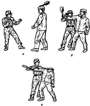 При ударе противником саперной лопаткой (рис. а) защищающийся выполняет резкий уход с линии атаки влево за счет базового движения. При этом он блокирует удар правой рукой (рис. б), а затем захватывает кисть вооруженной руки противника и прижимает ее локоть к груди. Левая рука давит на шею противника (рис. в). В конечной фазе приема защищающийся проводит болевое воздействие на его локоть и шею.