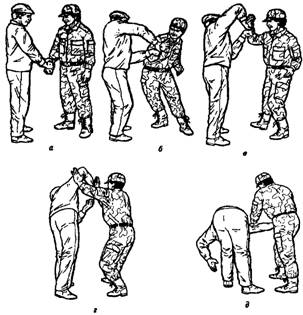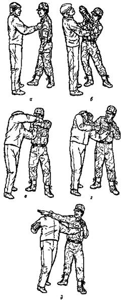 руками. Вариант 2 Противник крепко удерживает захваченную руку (а). В этом случае защищающемуся следует сделать ложный рывок на себя и за счет мощного поворота в левостороннюю заднюю стойку и резкого опускания локтя развернуть руки противника (рис. б). С поворотом в правостороннюю заднюю стойку защищающийся продолжает разворот рук противника (рис. в) и в конце разворота наносит удар левой рукой в локтевой сустав, выводя противника из равновесия, и освобождается от захвата (рис. г). Далее он правой рукой захватывает запястье противника и нажимом левой руки на локоть выпрямленной руки проводит болевое воздействие (рис. д). Освобождение от захвата за плечи