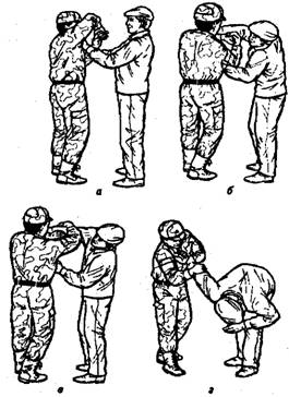 противника с одновременным удержанием ее кисти г шее сзади левой рукой. При этом защищающийся правой рукой захватывает правый локоть противника (рис. б). С резким базовым разворотом в правостороннюю заднюю стойку защищающий проводит болевое воздействие на локоть (рис. в). Атаку можно завершить ударом ногой в голову (рис. г).